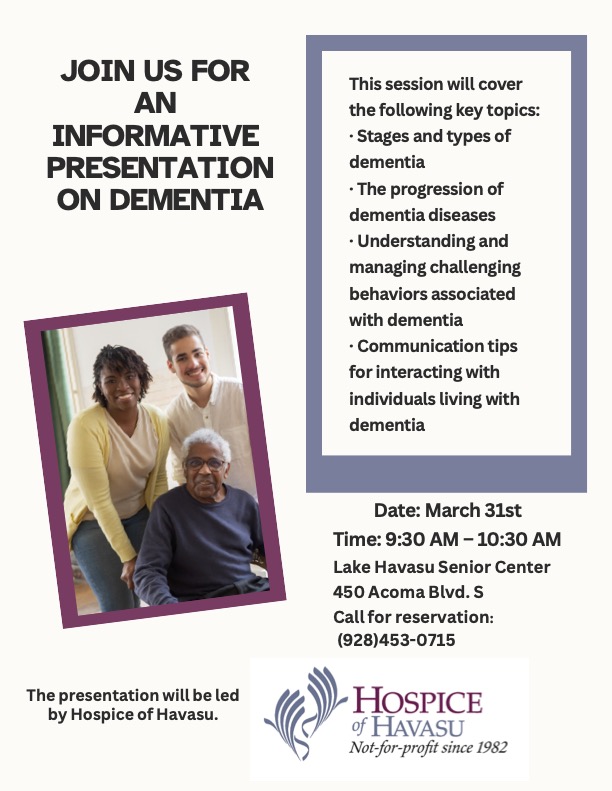 This presentation will be led by the experienced team from Hospice of Havasu, offering valuable insight into dementia-related conditions and the challenges that can come along with them.