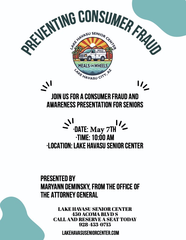 The Lake Havasu Senior Center invites local seniors to attend an important community presentation focused on Preventing Consumer Fraud and Increasing Awareness.